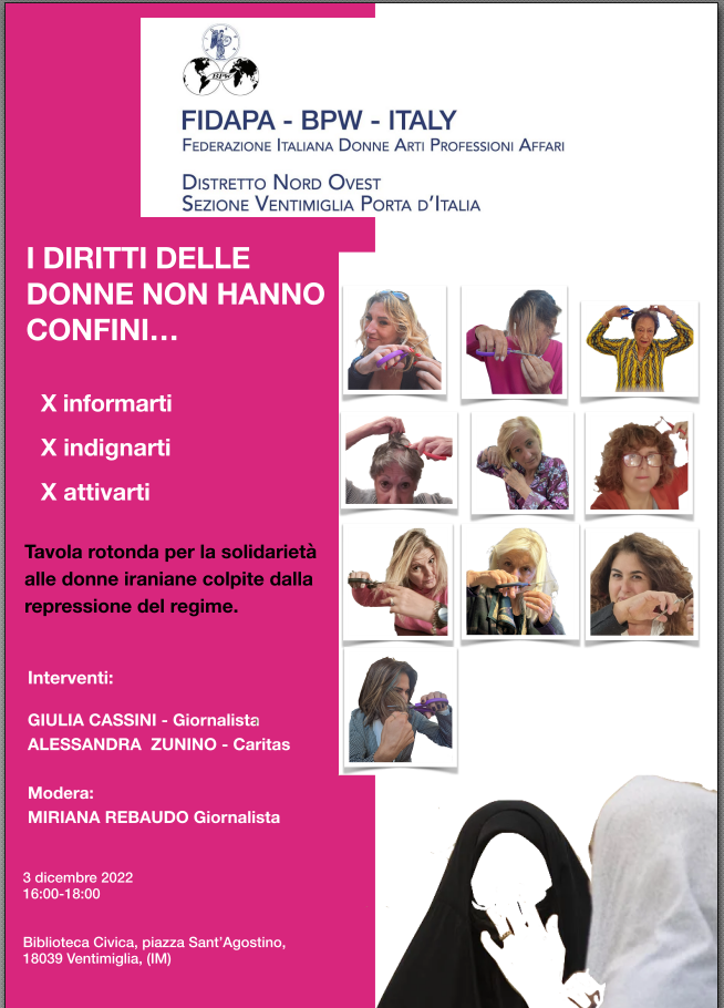 Settimana contro la violenza di genere – “I diritti delle donne non hanno confini…” Tavola rotonda per la solidarietà alle donne iraniane organizzata da FIDAPA, Sezione di Ventimiglia, con il patrocinio della Città di Ventimiglia – 03 dicembre 2022 ore 16,00 – Biblioteca Aprosiana, sede di p.zza Bassi