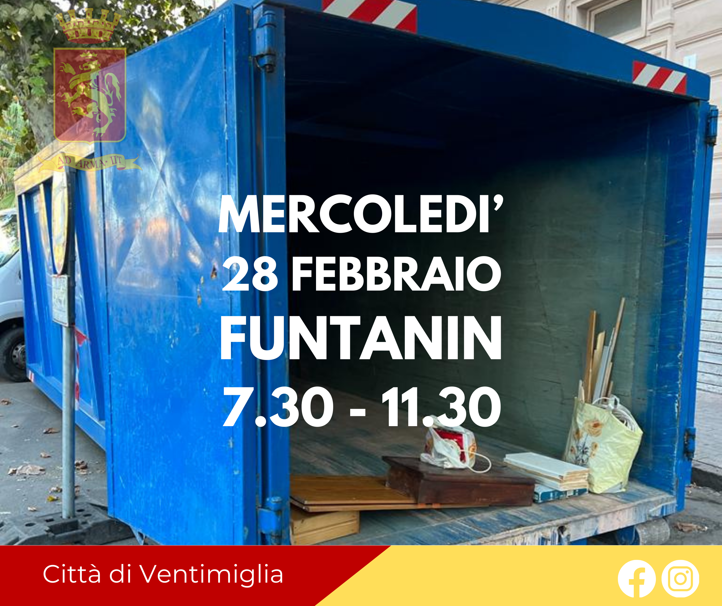 I cassoni saranno posizionati Mercoledì 14 Febbraio in Via Vittorio Vento, dalle 7.30 alle 11.30 e Mercoledì 28 Febbraio al Funtanin, sempre dalle 7.30 alle 11.30
