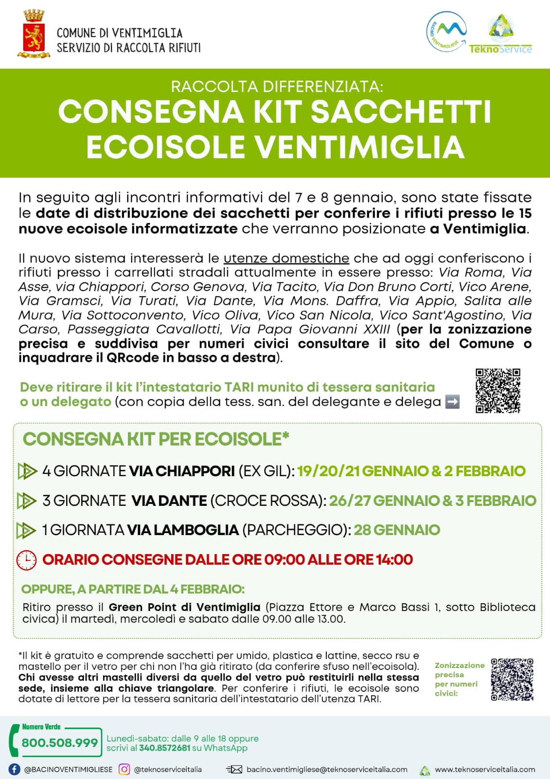 Le consegne dei kit avverranno dalle ore 09:00 alle ore 14:00 oppure, a partire dal 4 febbraio, sarà possibile il ritiro presso il Green Point di Ventimiglia (Piazza Ettore e Marco Bassi 1, sotto Biblioteca civica) il martedì, mercoledì e sabato dalle 09.00 alle 13.00.