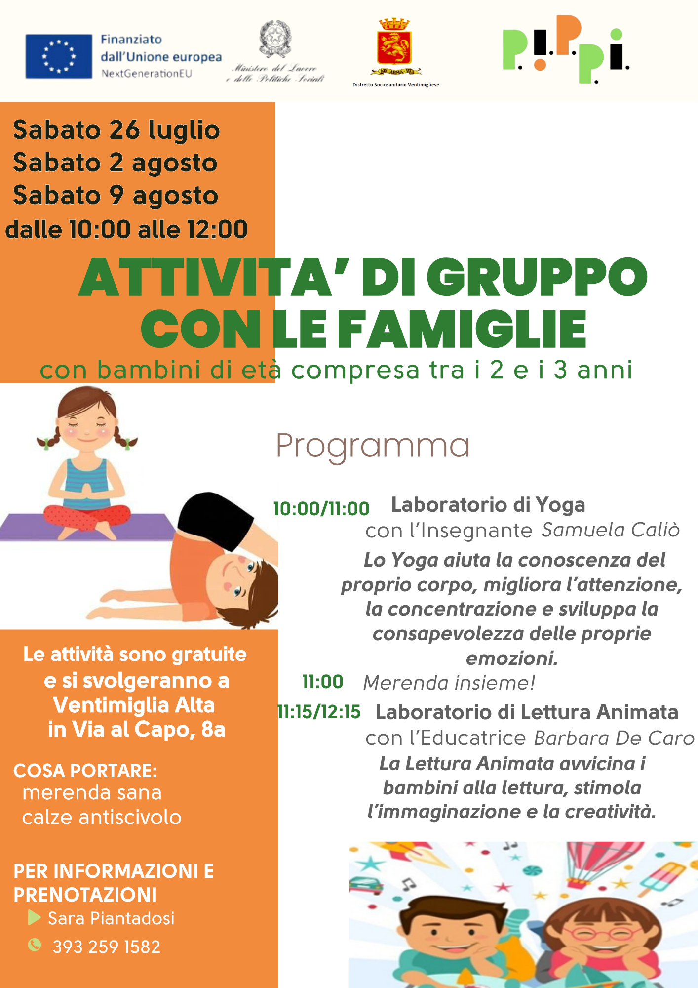 "Prosegue l'organizzazione di attività con le famiglie, grazie al finanziamento P.I.P.P.I. - PNRR. Invitiamo le famiglie con i loro bambini di età compresa tra i 2 e i 3 anni a Ventimiglia Alta per partecipare ad un Laboratorio di Yoga e a seguire ad un Laboratorio di Lettura Animata"