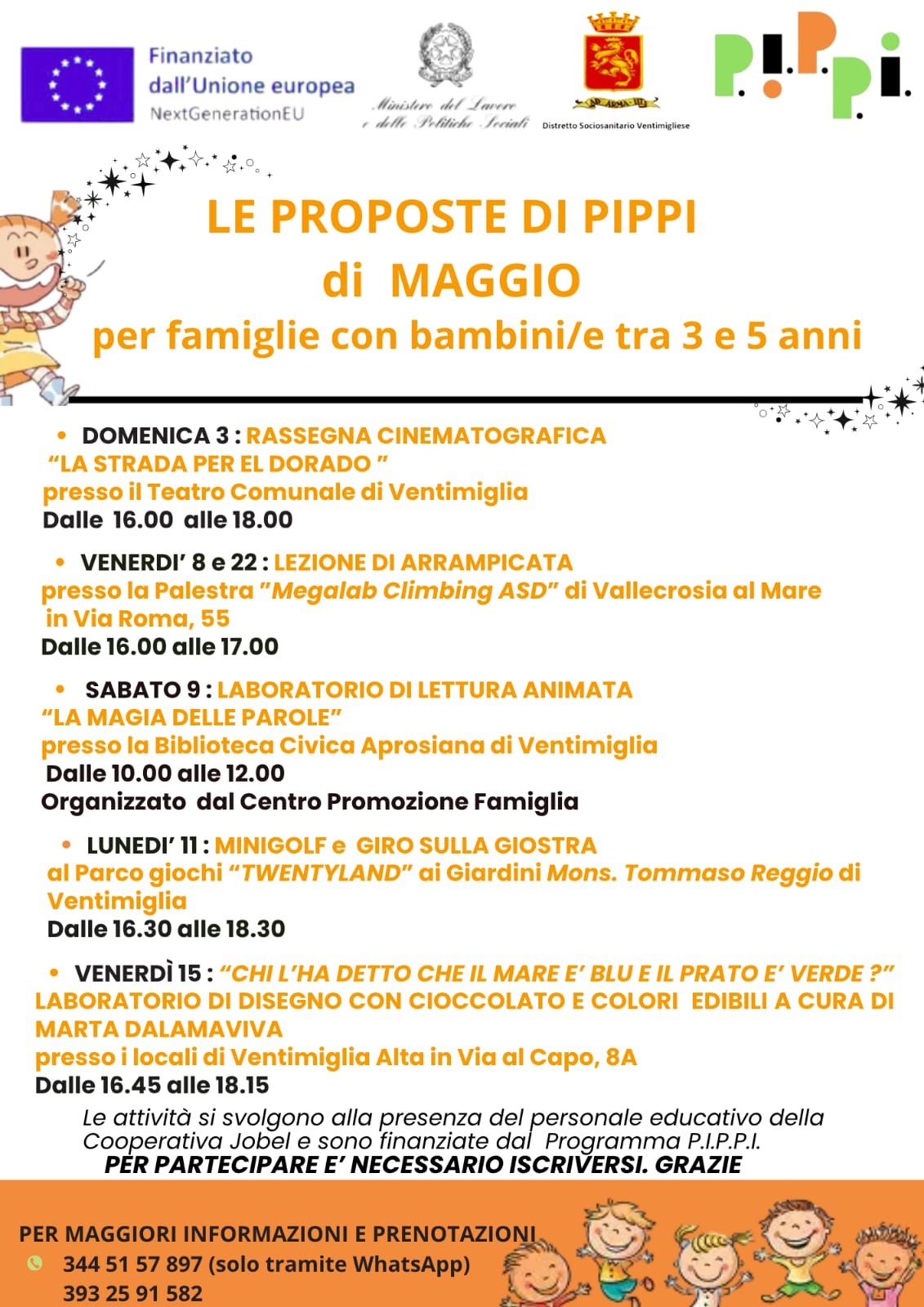 Per il mese di maggio siamo a proporre alcune attività rivolte ai ragazzini dagli 11 ai 15 anni ed altre per le famiglie con bambini di età tra i 3 e 5 anni. Le iniziative sono finanziate dal Programma PIPPI. Vi invitiamo ad iscrivervi e partecipare
