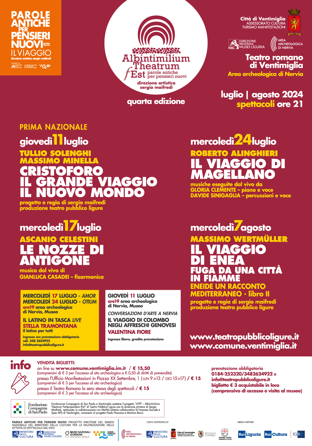 Da giovedì 11 luglio a mercoledì 7 agosto 2024 nel Teatro Romano dell’Area Archeologica di Nervia (corso Genova 134) vanno in scena quattro spettacoli teatrali (ore 21) di cui uno in prima nazionale dedicati all’avventura del viaggio: “Cristoforo. Il grande viaggio. Il nuovo mondo”