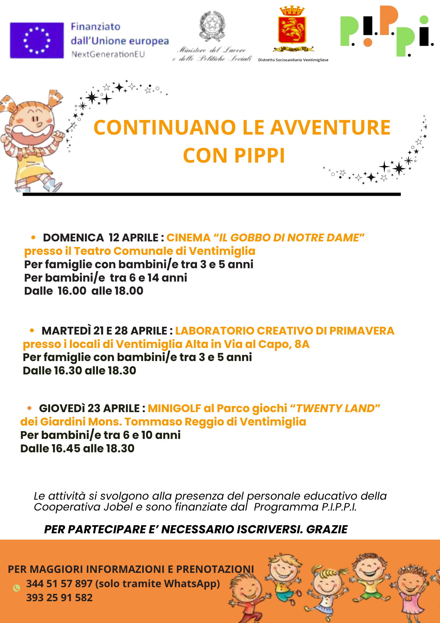Per il mese di aprile abbiamo organizzato altre iniziative. Invitiamo le famiglie a leggere il volantino e prendere contatti per le iscrizioni. Le attività sono gratuite e finanziate con il PNRR - PIPPI