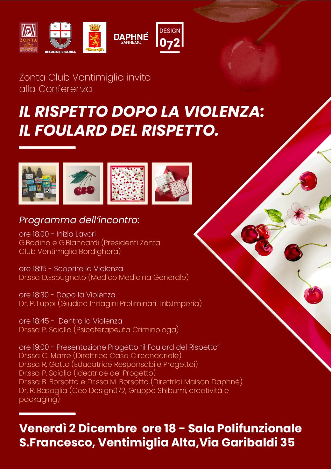Settimana contro la violenza di genere – “Il rispetto dopo la violenza: il foulard del rispetto” – Conferenza organizzata dallo Zonta Club Ventimiglia con il patrocinio della Città di Ventimiglia – 02 dicembre 2022 ore 18,00 – Sala Polifunzionale San Francesco, Via Garibaldi