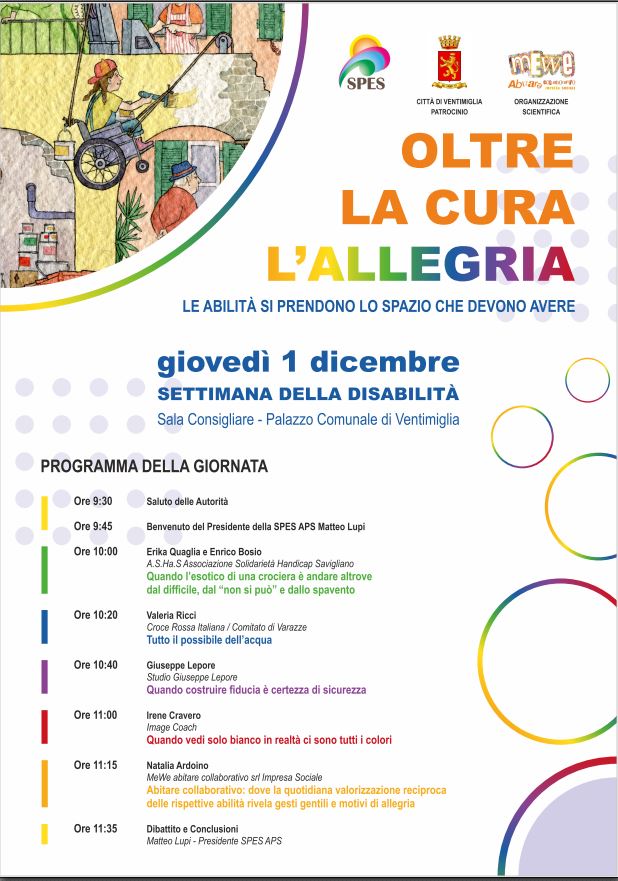 Giovedì 1 Dicembre. Oltre la cura l’allegria - Le abilità si prendono lo spazio che devono avere - Convegno organizzato da Spes con il patrocinio della Città di Ventimiglia e la collaborazione scientifica di "ME We" in occasione delle giornata mondiale dell'handicap 2022