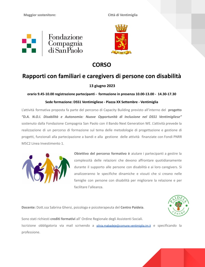 L’attività formativa proposta fa parte del percorso di Capacity Building previsto all’interno del progetto “D.A. N.O.I. Disabilità e Autonomia: Nuove Opportunità di Inclusione nel DSS1 Ventimigliese”