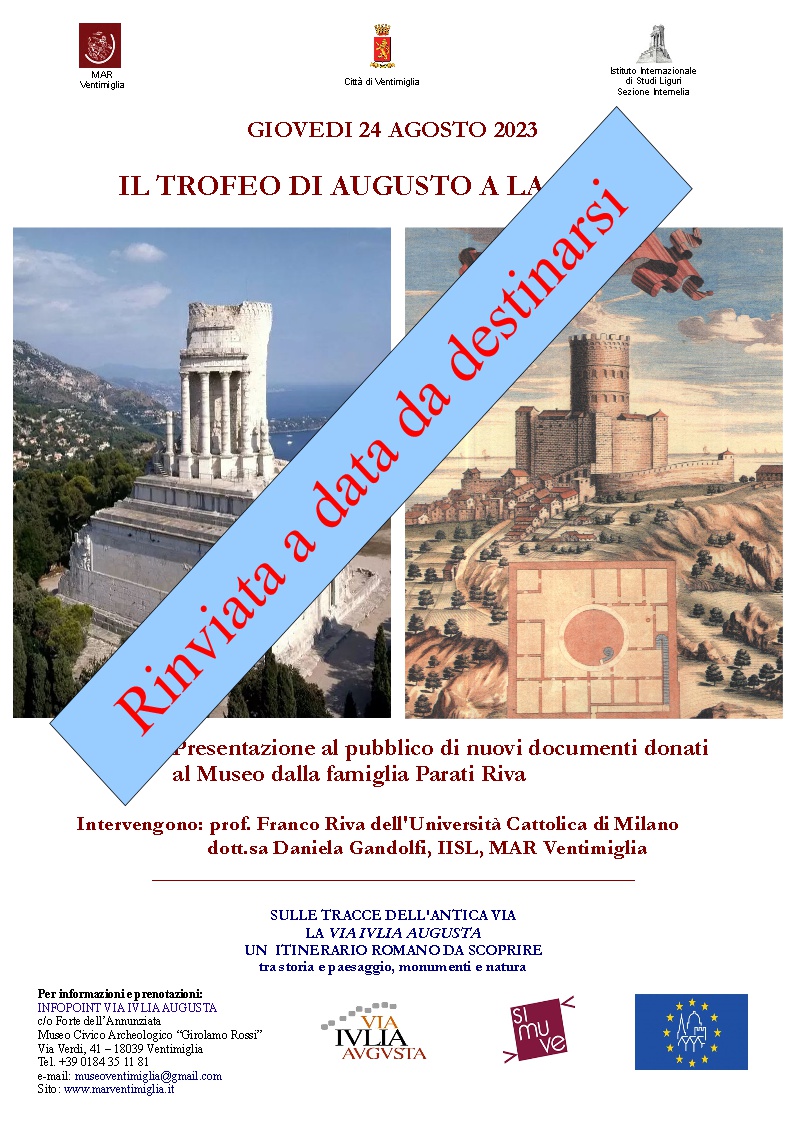 A causa della bolla di calore che sta interessando il Ponente Ligure, la conferenza prevista per giovedì 24 agosto alle ore 16.30 nella Sala “Emilio Azaretti” del Forte dell'Annunziata dedicata al trofeo di Augusto a La Turbie e ai documenti iconografici donati al Museo dalla famiglia Parati Riva di Milano, è stata rinviata a data da destinarsi.