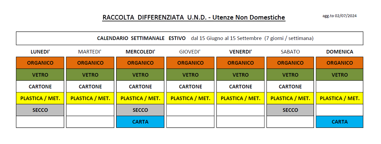 Con Delibera di Giunta N. 110 del 20/06/2024 e successiva Determinazione N. 512 del 27/06/2024 è stato potenziato il servizio di raccolta dei rifiuti per le U.N.D. “Utenze Non Domestiche”, considerato che al momento questo non appariva sufficiente e soprattutto in considerazione del maggior afflusso turistico che si rileva nel periodo estivo.