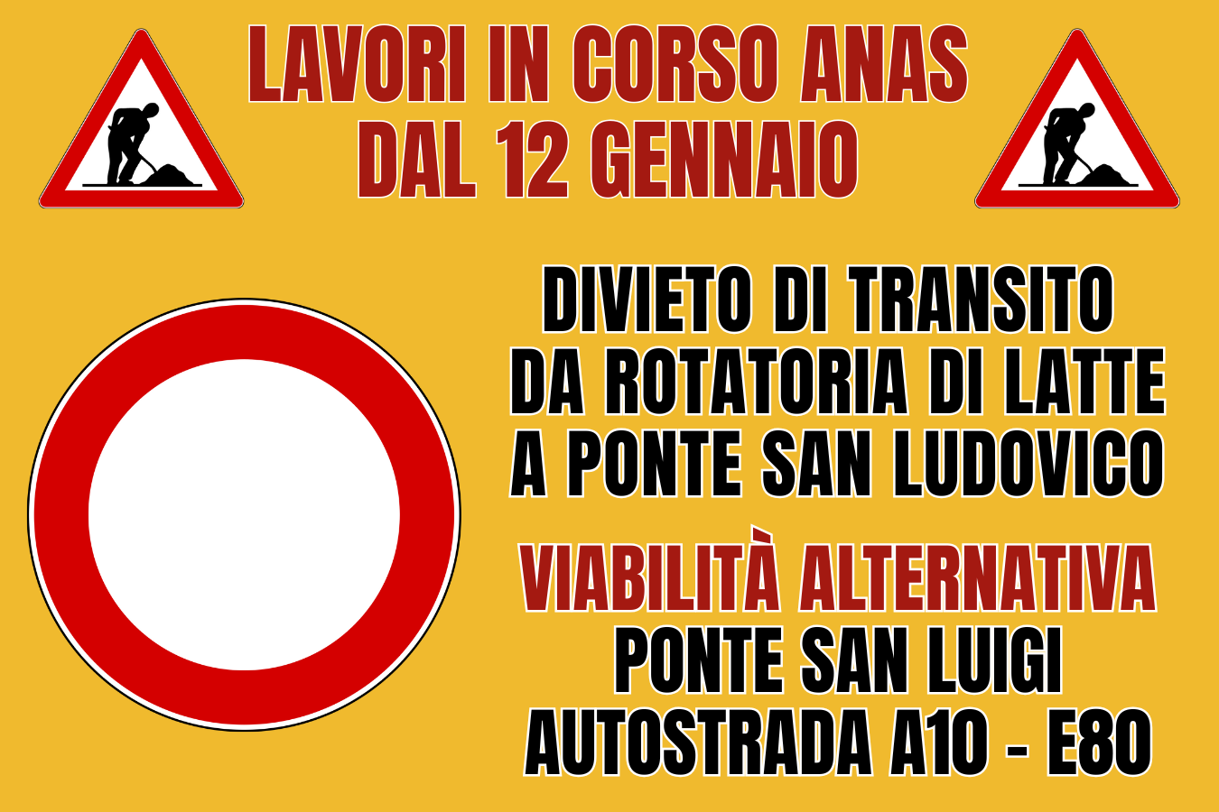 Si comunica che a partire da Lunedì 12 gennaio 2026, dalle ore 8.00, e sino al 12 maggio 2026, la Strada Statale 1 Aurelia, direzione Balzi Rossi, dalla rotatoria di Latte al Confine di Stato di Ponte San Ludovico, sarà chiusa al transito in entrambe le direzioni per consentire l’avvio dei lavori di risanamento delle gallerie “Dogana” e “Balzi Rossi”, a cura di ANAS S.p.A.