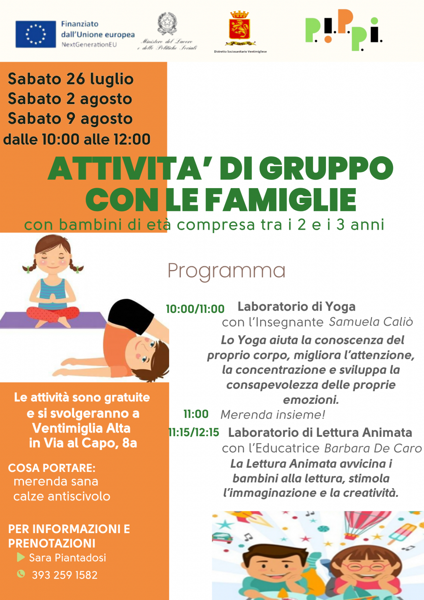 “Prosegue l’organizzazione di attività con le famiglie, grazie al finanziamento P.I.P.P.I. - PNRR. Invitiamo le famiglie con i loro bambini di età compresa tra i 2 e i 3 anni a Ventimiglia Alta per partecipare ad un Laboratorio di Yoga e a seguire ad un Laboratorio di Lettura Animata”