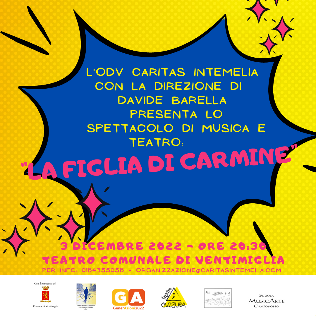 In occasione del trentesimo anniversario dell’organizzazione Caritas Intemelia sabato 03 dicembre alle ore 20,30 presso il Teatro Comunale di Ventimiglia si terrà, con il patrocinio della Città di Ventimiglia, la prima dello spettacolo teatrale “la figlia di Carmine”. Autori i ragazzi della compagnia “Teatro Abusivo”, diretti da Davide Barella e accompagnati dalla musica originale di “Trio Scampato +1”. La popolazione è cordialmente invitata.