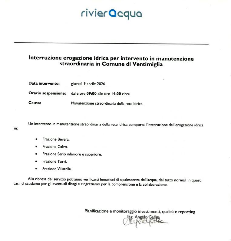 Giovedì 9 aprile 2026 dalle ore 09:00 alle ore 14:00 Manutenzione Straordinaria della rete idrica.