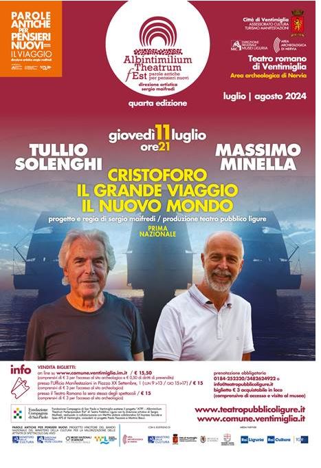 L'11 luglio alle 21 al Teatro Romano va in scena la prima nazionale di Teatro Pubblico Ligure, ideata e diretta da Sergio Maifredi: “Cristoforo. Il grande viaggio. Il nuovo mondo” con Tullio Solenghi e Massimo Minella, un grande attore e uno scrittore giornalista, vicecaporedattore vicario della redazione ligure di “la Repubblica”, che ripercorrono l’esplorazione del navigatore genovese. La sua vita è stata romanzo, mistero, fantasia. Dietro all’esistenza straordinaria di Cristoforo Colombo c’è un mondo nuovo, o nuovamente ritrovato, che continua a parlarci. Quel viaggio, quella scoperta, quel ritorno a casa per consentire ad altri di ripercorrere la stessa rotta, sono stati gli elementi cardine su cui si è sviluppato il mondo moderno. È stato lui, Cristoforo, a traghettarci dal Medioevo all’età moderna con le sue intuizioni e i suoi errori. Lui, con le sue convinzioni, il suo desiderio di navigare, di scoprire, di raccontare. Lui, protagonista di un mondo che invece altro chiedeva, a cominciare dall’oro. Attorno a questa storia se ne concentrano tante altre. Uno sviluppo mai ordinato, più spesso dettato dalle circostanze, dalle coincidenze, dal fato. Alla fine, resta il racconto di un mondo reale e magico al tempo stesso. Resta il grande viaggio che non è mai terminato.