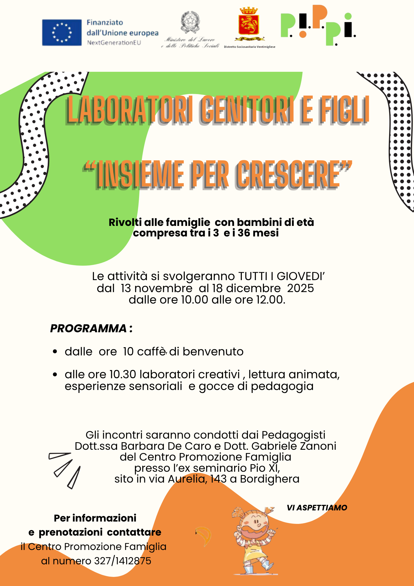 Invitiamo le famiglie con bambini in età compresa tra 0 e 36 mesi a partecipare alle attività che si svolgeranno dal 13 novembre al 18 dicembre presso il Centro Promozione Famiglia in Via Aurelia 143 a Bordighera. L’iniziativa è gratuita ed è finanziata dai fondi del Programma PIPPI PNRR