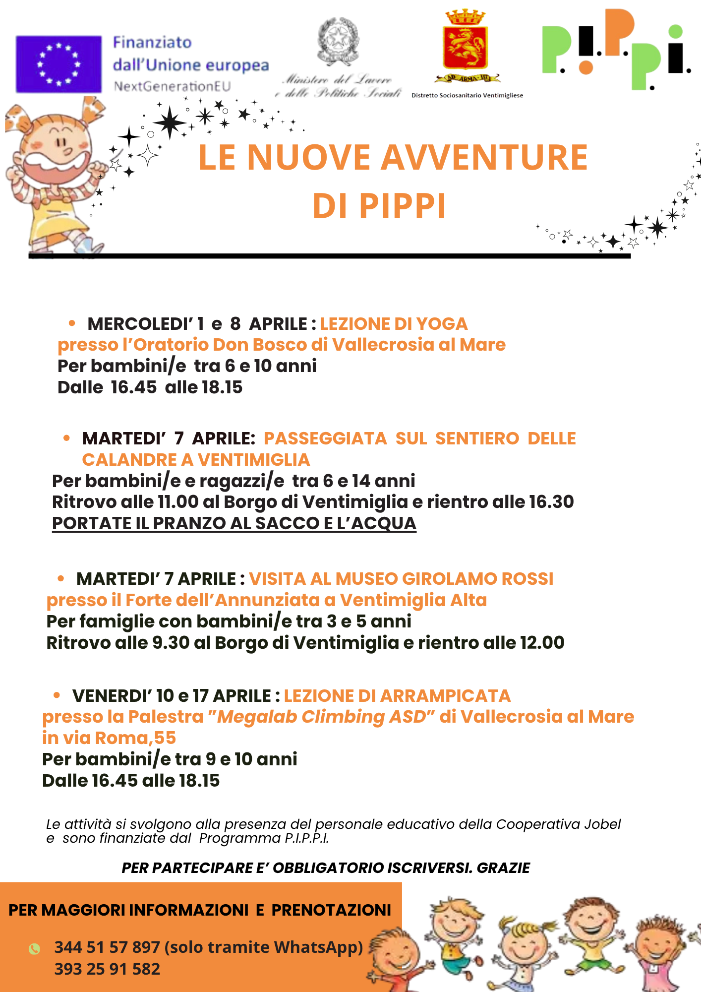 Per il mese di aprile abbiamo organizzato altre iniziative. Invitiamo le famiglie a leggere il volantino e prendere contatti per le iscrizioni. Le attività sono gratuite e finanziate con il PNRR – PIPPI
