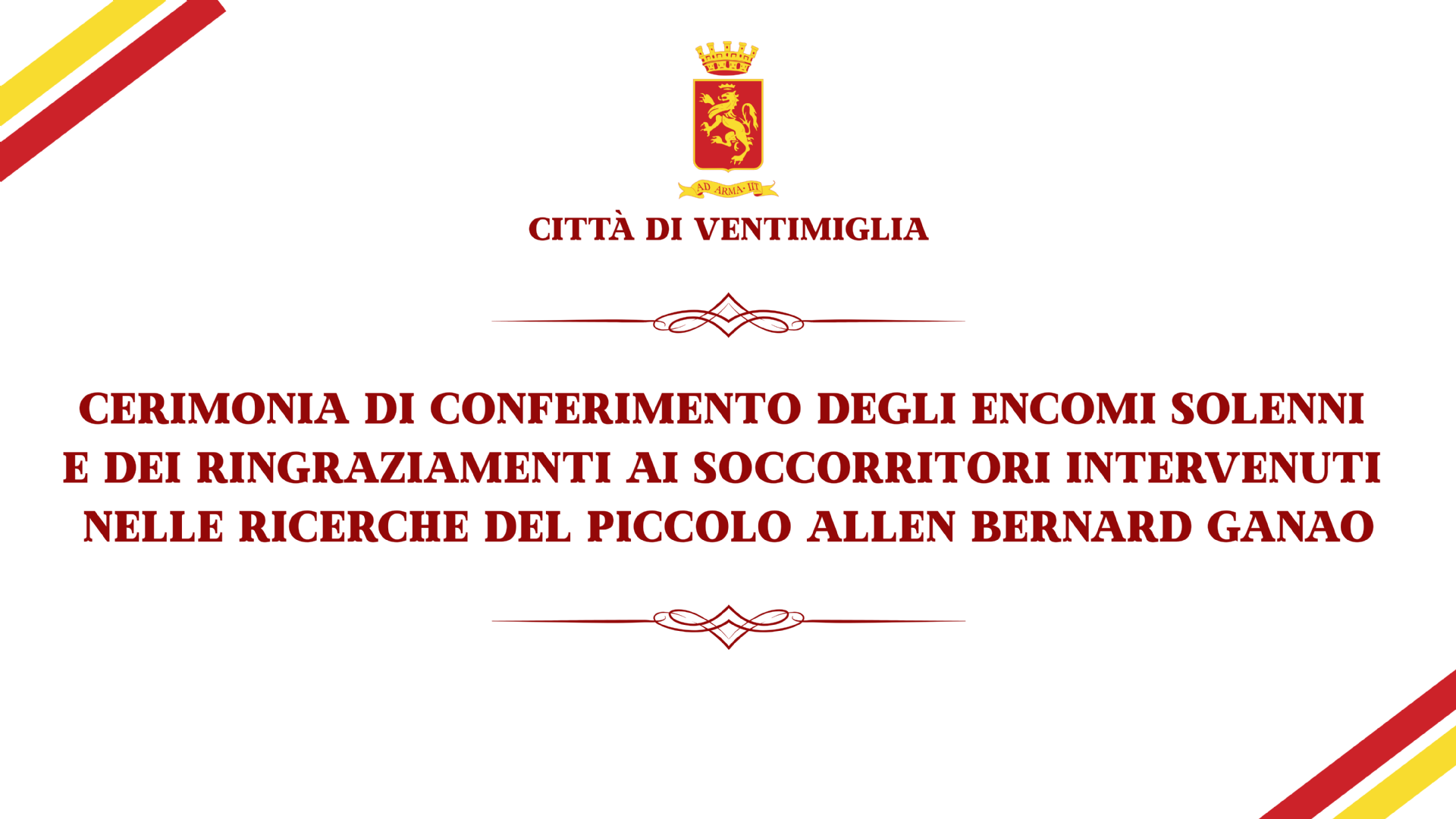 Domani, Mercoledì 16 Luglio ore 11.00 presso l'aula Consigliare del Comune di Ventimiglia, si svolgerà la cerimonia di conferimento degli encomi solenni e dei ringraziamenti ai soccorritori intervenuti nelle ricerche del piccolo Allen Bernard Ganao.