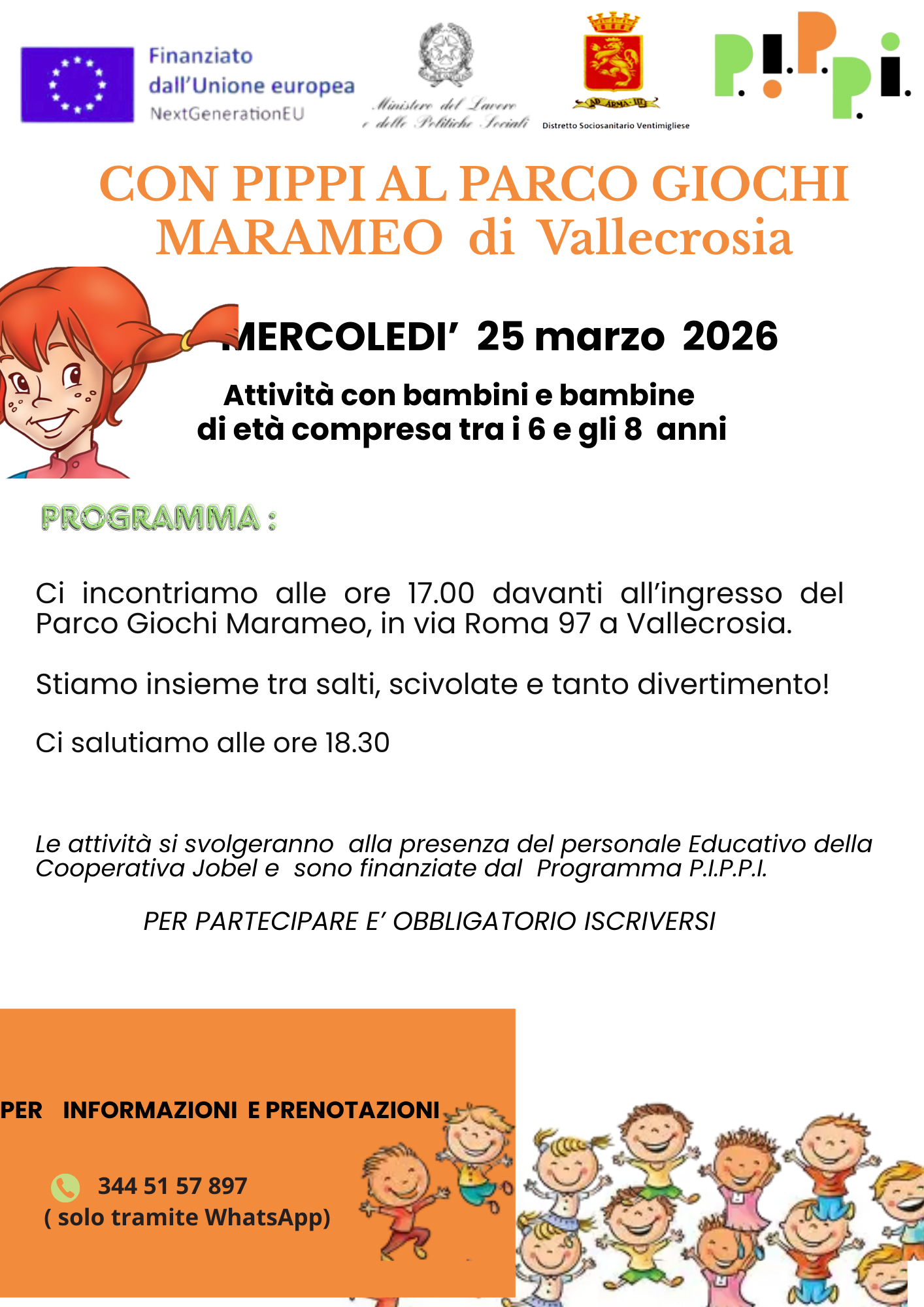 Grazie al finanziamento PNRR PIPPI abbiamo organizzato un altro momento di gioco e condivisione al Parco Giochi Marameo, questa volta con i più grandicelli dai 6 agli 8 anni. Per la stessa fascia di età proponiamo anche due momenti in cui provare l’arrampicata. Vi aspettiamo. È necessario prenotarsi ai numeri indicati.