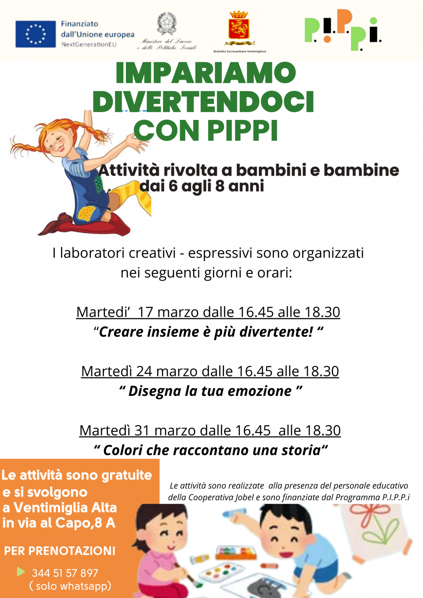 Invitiamo le famiglie a partecipare alle iniziative organizzate per martedì 24 marzo. Le attività sono finanziate dal Programma PIPPI - PNRR.